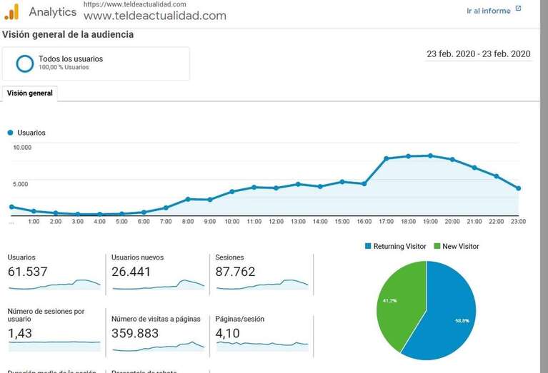 Telde.- TELDEACTUALIDAD acumuló 87.762 visitas, 359.883 páginas visitas y 61.537 usuarios distintos durante la jornada de este domingo, 23 de febrero, en la que este periódico cubrió todos los frentes informativos ocasionados por los incendios, calima, accidentes y actualidad local.