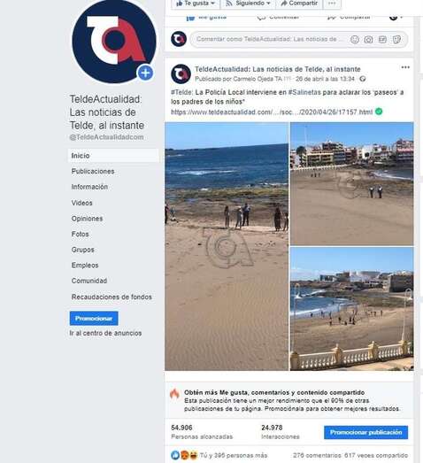 Telde.- La noticia de TELDECTUALIDAD sobre la intervención policial el pasado domingo en la playa de Salinetas para aclarar los paseos a los padres que salieron con sus hijos a la arena de esta cala teldense ha tenido un extraordinario impacto en las redes sociales de este periódico digital y en sus estadísticas certificados por Google Analytics.