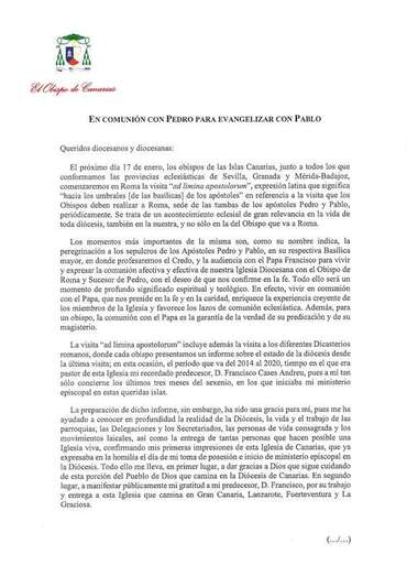 Carta que el Obispo de esta Diócesis de Canarias, Monseñor José Mazuelos Pérez, ha hecho pública con motivo de la visita ad limina apostolorum que realizará a Roma a partir del próximo lunes, 17 de enero, “un acontecimiento eclesial de gran relevancia en la vida de toda diócesis, también en la nuestra, ...” que se suele realizar cada 5 años, y en la que explica los momentos más importantes de la misma.