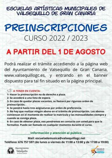 Para ampliar esta información, las personas interesadas pueden contactar a través del correo escuelademusica@valsequillogc.net o llamando, de lunes a viernes en horario de 11.00 a 13.00 y de 17.00 a 19.00. al número 676.757.597.