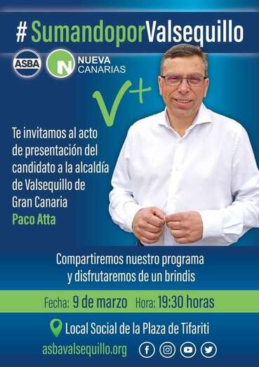 Francisco Atta revalida su candidatura a la Alcaldía de Valsequillo. El próximo 9 de marzo, jueves, a partir de las 19.30 horas, tendrá lugar el acto de presentación en el local social de la Plaza de Tifariti. Atta expondrá las principales líneas de su programa electoral y resolverá dudas de los vecinos.