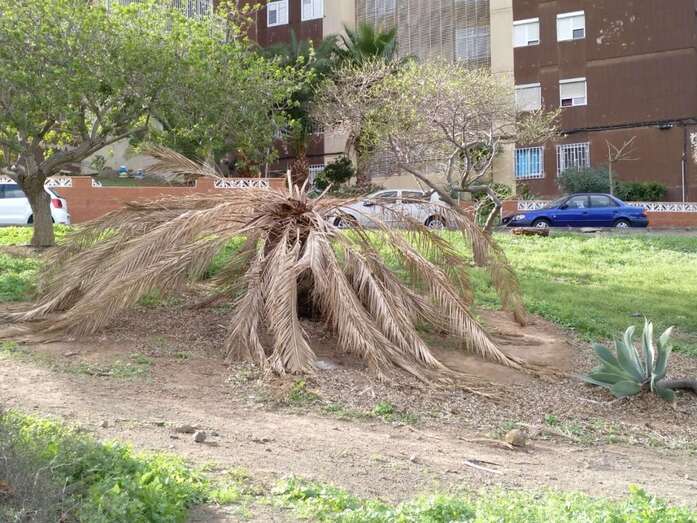 La falta de atenciones ha condenado a la muerte a varias palmeras de un espacio verde público próximo a Eucaliptos I.