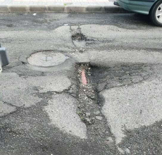 Un socavón en el asfalto ha dejado al descubierto un tubo subterráneo con cables que, según vecinos, podrían ser de alta tensión.