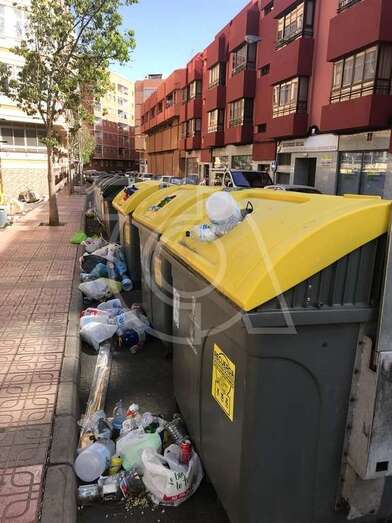 Contenedores para la recogida de plásticos a tope en la calle de Juan Negrín, esquina Picachos, en el sector de Los Llanos de Telde.