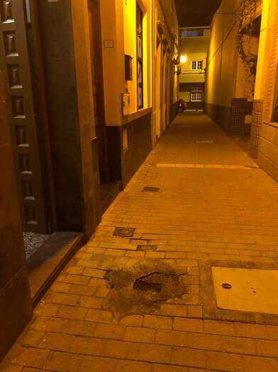 Un socavón en la calle de Diego López (Los Llanos) es punto de caídas y donde los perros hacen sus necesidades.