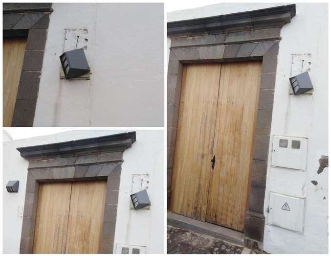 Una farola se ha descolgada en la fachada principal de la antigua casona de Los Sall en el núcleo histórico de San Francisco.