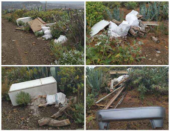 Buenas tardes. Hoy haciendo la ruta de senderismo por los volcanes de Rosiana (Telde) me encontré esto, los clásicos escombros, silla de bebé y parachoques de fibra. ¿La gente es incívica o no sabe que hay puntos limpios? En la parte alta (Senderista).
