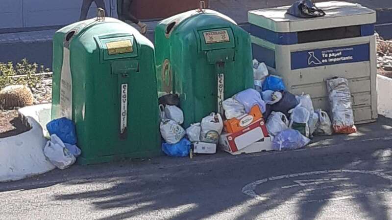 Esto ocurro frente a la parada de taxis de Melenara. Los incívicos por no caminar depositan la basura en el suelo al lado de depósitos de embotellados y cartón en la misma carretera (Maite).