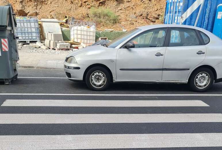 Paso de peatones en Jinámar interrumpido por coches y cubos