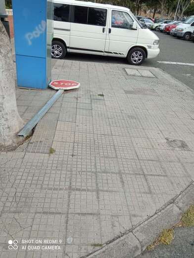 Buenas noches: Esta señal de tráfico lleva caída sobre la acera en la zona de Eucaliptos I (Valle de Jinámar), entre el bloque 8 y 9. Muchas gracias (Mary).