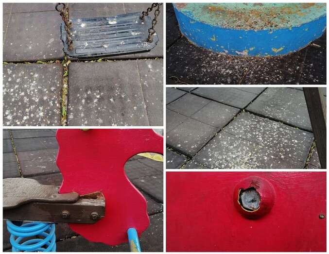 Hola. Me gustaría informar del estado del parque Pinocho, lleno de cacas de paloma, sucio, los columpios con partes cortantes, el suelo levantado, etcétera (Vecina de la zona)