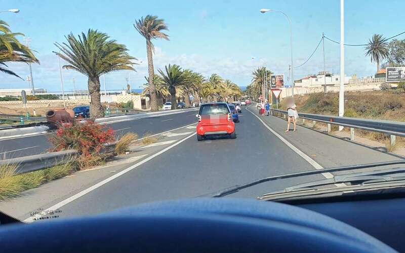 Muy buenas.Esto es de ahora mismo. Es increíble que después de más de 30 años que se hizo la circunvalación de Telde y la autovía que sube a Telde, no se haya hecho pasos de peatones. Ahí hay 3 personas esperando que no vengan coches o les dejen pasar los conductores por la falta de pasos de peatones. Está el peatón completamente denostado en toda la circunvalación y la autovía (Berna).