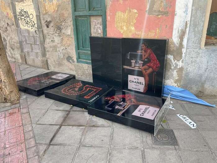 Estantes publicitarios tirados en una calle de Los Llanos