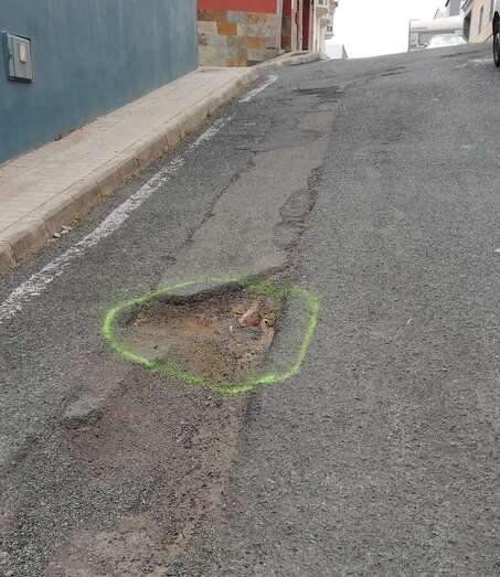 Buenas tardes: Quería hacer llegar al responsable de Vías y Obras del ayuntamiento de Telde este enorme bache muy peligroso para motos y bicicletas así como para los turismos que circulan por esta calle de Diego de Silva a la altura del número 13 en el barrio del Lomo de la Herradura. Ayer un niño se accidentó en dicho bache ya que está en una vía con una bajada prolongada y no se ve, con el consiguiente peligro. Muy atentamente un vecino de la Herradura (Roberto).