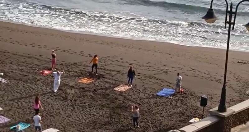 Música en la arena de Melenara este domingo a las 9 de la mañana. El potente altavoz de color negro se puede ver a la derecha de la foto. Cosas como esta solo suceden en Telde (José Manuel Suárez).
