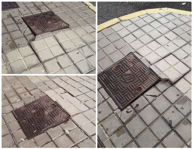 Buenos días. Quiero denunciar la situación de las aceras con resaltes peligrosos para los viandantes y peatones en la confluencia de las calles Palos de Moguer y Hermanos Pinzón en Clavellinas (Sindo)