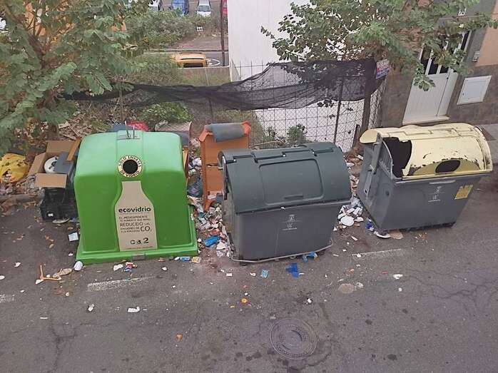 Buenas tardes. Me gustaría poner una queja al Ayuntamiento de Telde o a la empresa encargada de recoger basura en el municipio. Después de cada fin de semana, los lunes nos encontramos estas cosas. Se encuentra en la calle Cura Gordillo, en La Herradura. Contenedores rotos, muebles, basura a los alrededores, peste y animales que se acercan a la basura. Me gustaría que pusieran una solución cuanto antes, ya que vivimos enfrente y tenemos que aguantar olores y suciedades (Verónica).