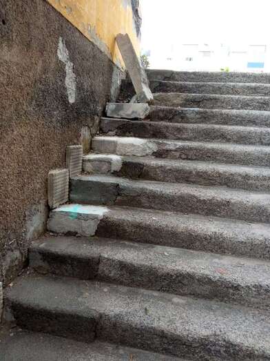 Hoy, día de reparto de alimentos en el Valle de Jinámar y nadie se ha dignado en pasar por aquí a reparar este problema. Estarán esperando a que alguien sufra una caída. La AV Solidaridad del Valle ha tenido que activar protección para sus beneficiarios ya que nadie responde a la solicitud de reparación de la escalera de acceso a la unidad alimentaria (Juan Medina).