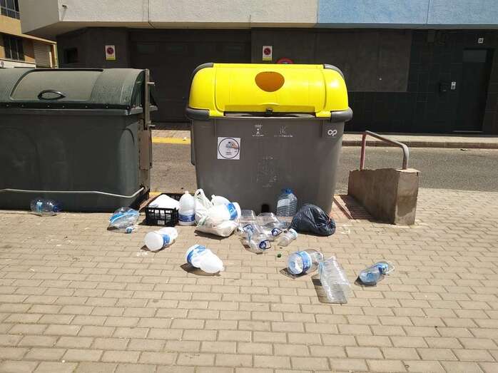 En Clavellinas. No lo vaciaban desde antes del viernes. Como estaba a tope la gente depositaba al lado en recipientes más 'plástico'. Hoy lunes vienen a recoger y dejan todo lo que no estaba en el interior como muestra la imagen. Saquen sus propias conclusiones (Alberto).