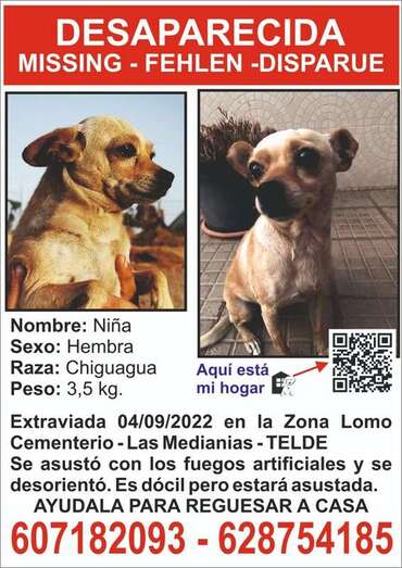 Buenos días: Pido ayuda para localizar a una perra chiguagua que está perdida desde el pasado domingo en el sector de Lomo Cementerio-Las Medianías. Los datos están en la foto (Esther).