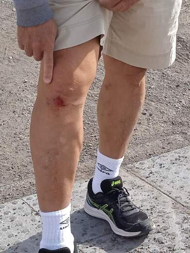 Buenos días: Esta herida es como consecuencia del rebaje en la acera que se encuentra en la calle 12 de Octubre en Clavellinas. Solar que se está utilizando como aparcamientos y dicha vaguada que está como paso de peatones y minusválidos. Los coches patinan y la dejan llena de tierra, de ahí que sufriera en la mañana de hoy sábado una aparatosa caída y gracias que solo sufrí daños en las dos rodillas. Mi nombre es Antonio Medina y solicitó la colaboración ciudadana para dar con el chico que me ayudó cuando caí, a quien estoy muy gradecido. Mi teléfono es el 638.44.66.50.
