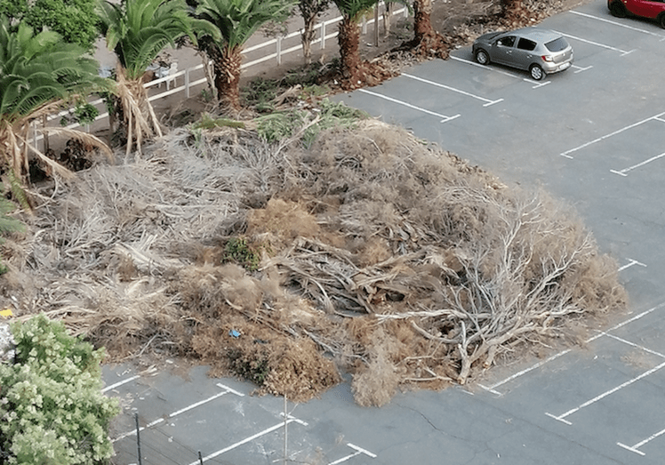 Vecinos de El Cortijo Club de Campo de Telde denuncian la acumulación de ramas secas y restos vetales, en gran cantidad, en los aparcamientos de este recinto del Valle de Jinámar. Advierten del peligro potencial que supone dada la proximidad de edificios.