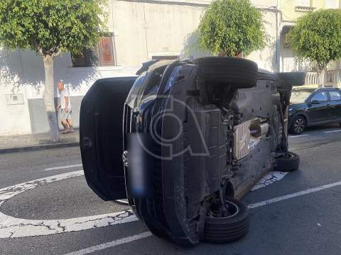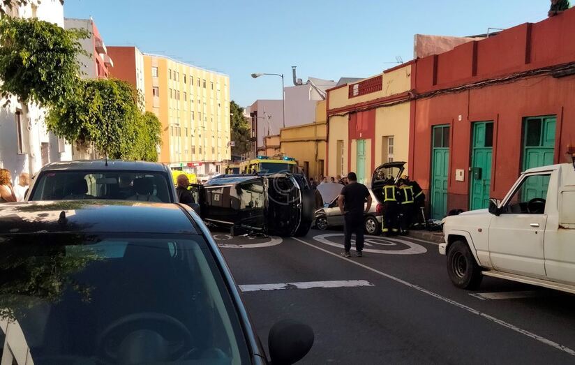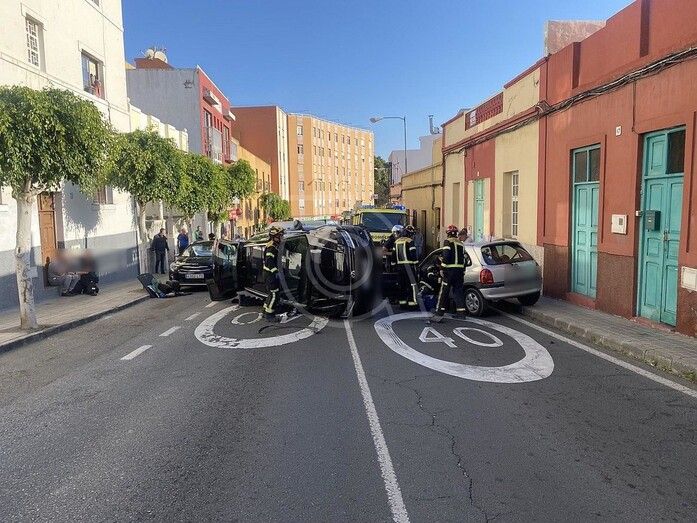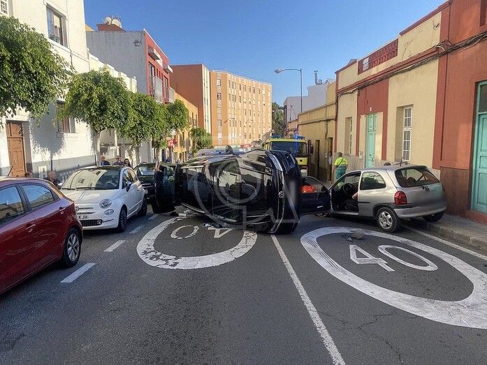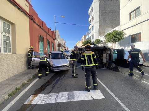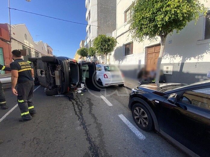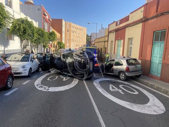 Un vehículo con dos ocupantes ha volcado esta mañana, a las 8.55 horas, en la calle de Doctor Melián, en el tramo de salida hacia Lomo Cementerio, cuando circulaba en sentido La Rocha, tras colisionar con otro de menor cilindrada que discurría en dirección hacia la rotonda de La Barranquera.
