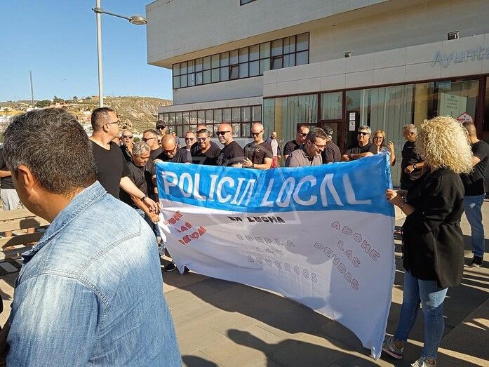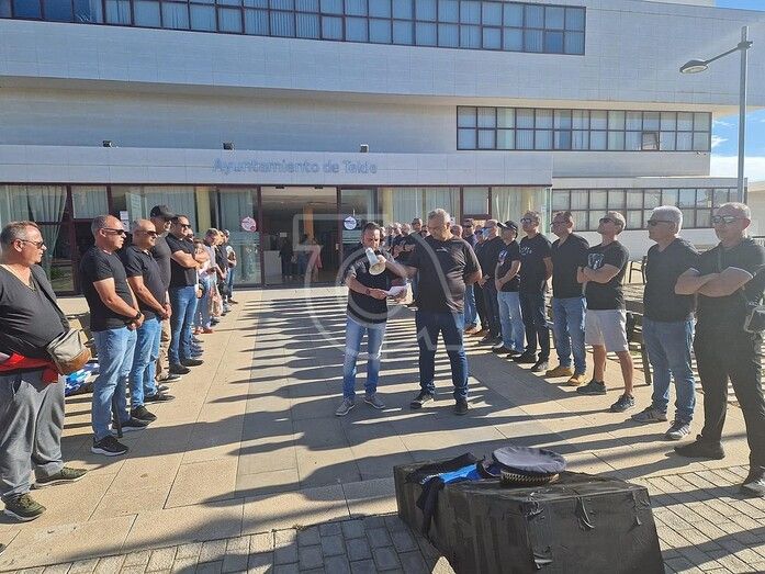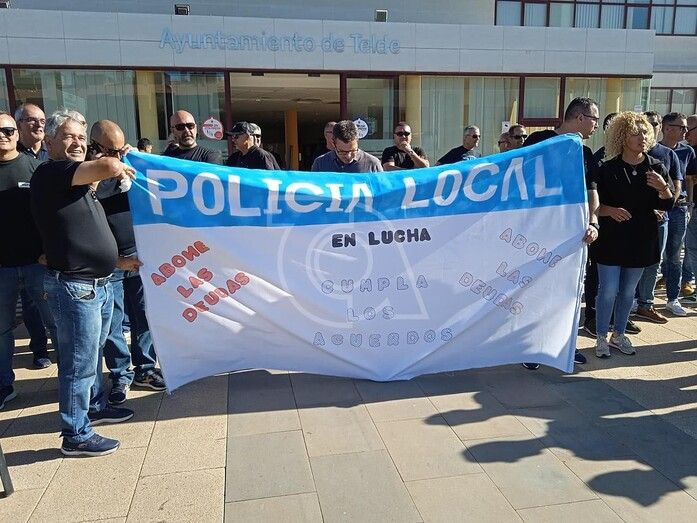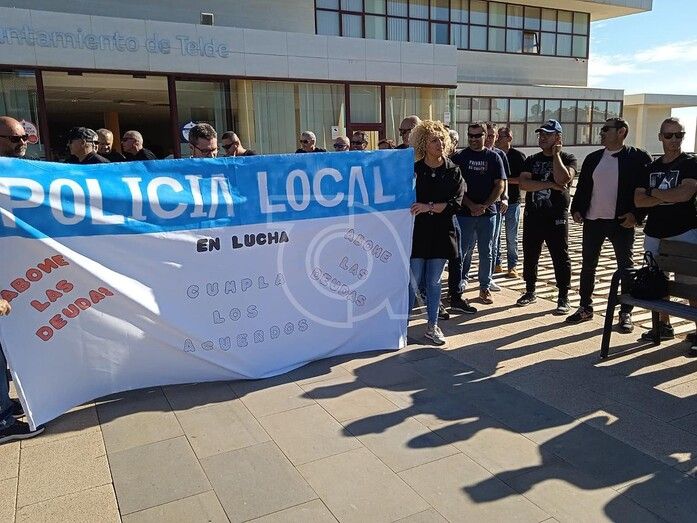 Medio centenar de personas ha secundado la concentración convocada por la Plataforma del Colectivo de Profesionales de la Policía Local de Telde ante las oficinas municipales de El Cubillo para exigir mejoras en sus condiciones de trabajo, más medios para este cuerpo de seguridad y el pago de los servicios extraordinarios.