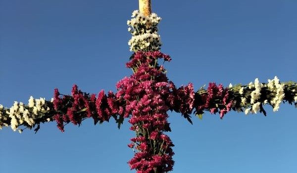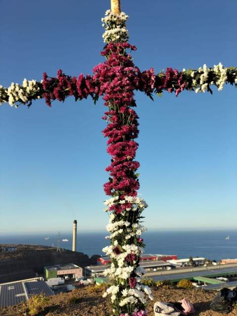 La Santa Cruz de la Montaña Negra de Jinámar luce enramada desde este martes gracias a la iniciativa de un grupo de vecinos que subieron hasta lo alto de la cima de este cono volcánico para su ornato floral.