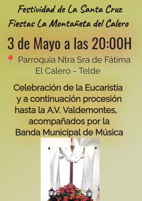 La Montañeta de El Calero celebrará este miércoles la fiesta de la Cruz con una misa en la Parroquia de Nuestra Señora de Fátima. Los oficios tendrán lugar a las 20.00 horas y luego habrá procesión hasta el local social de Valdemontes con el acompañamiento de la Banda Municipal de Música.