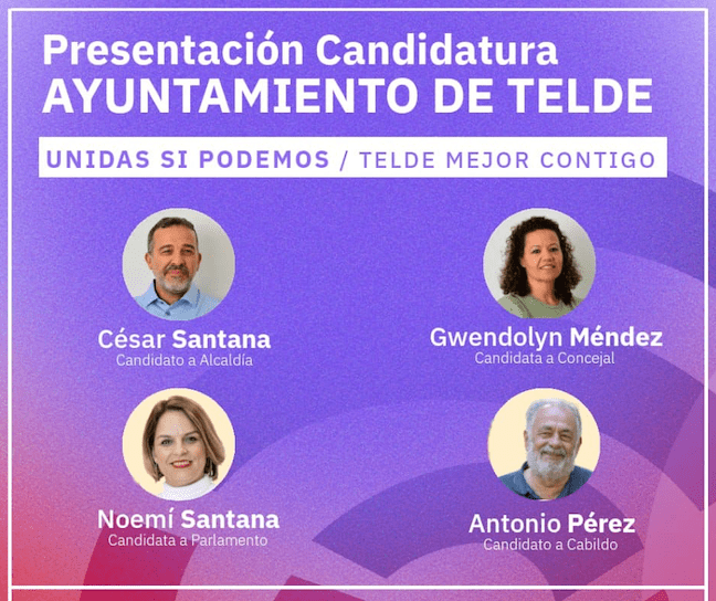 Bajo el lema Telde mejor contigo, César Santana, candidato a la Alcaldía, y Gwendolyn Méndez, candidata a concejala, mostrarán las propuestas de esta formación de izquierdas a todos los asistentes.