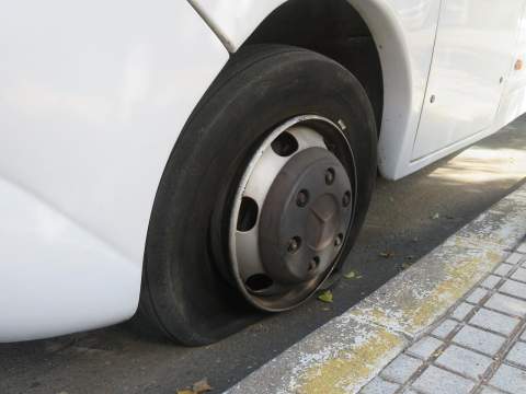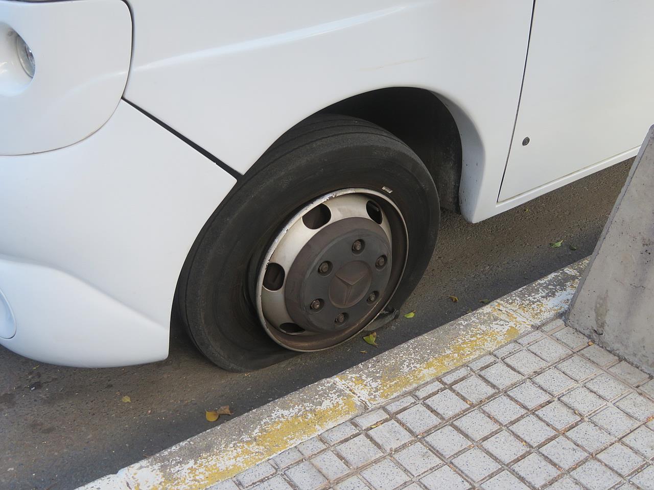 Un microbús de Pardilla Bus que cubre la línea 5 de transporte público, que enlaza el casco urbano con el sector costero de Melenara-Salinetas, sufrió esta tarde el reventón de uno de sus neumáticos delanteros cuando se aproximaba a la parada de guaguas que está justo a la altura de Salinetas.