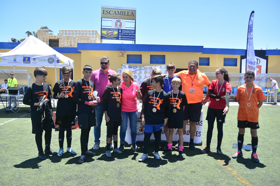Durante toda la mañana, los casi cincuenta participantes que se dieron cita en el campo municipal de Las Huesas se ejercitaorn a fondo para conseguir ser el campeón de esta primera edición, disfrutando de un día plenamente festivo con todo lo que se había preparado desde la organización (castillos hinchables, talleres de pintacaras, rifas, stands solidarios, ect.). Una jornada donde también se homenajeó a José el Pulpo Lozano, portero teldense que militó durante muchos años en equipos de categoría nacional como la UD Telde o UD Vecindario, desarrollando desde su retirada la función específica de preparador de porteros en muchos clubes del municipio teldense.