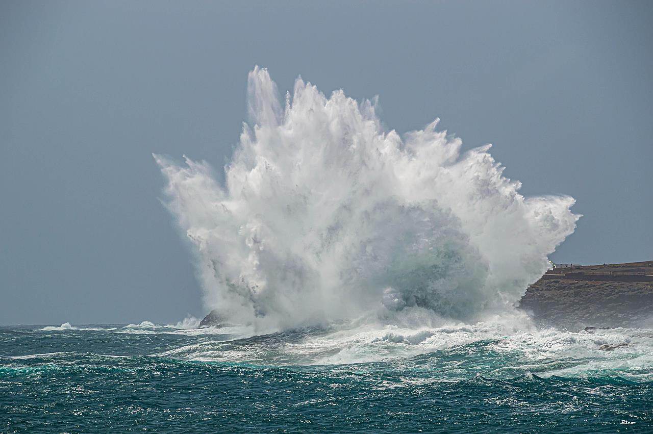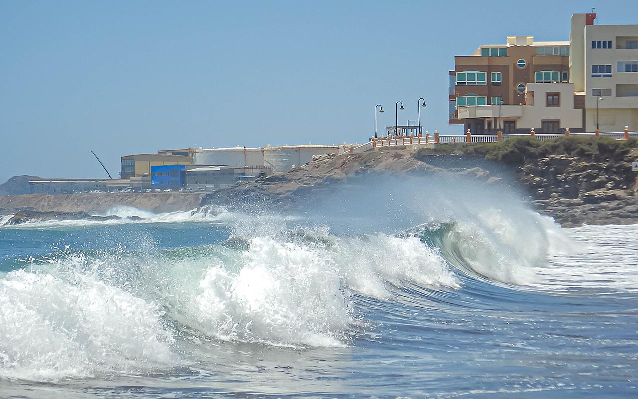 La costa de Telde, en el sector oriental de la isla de Gran Canaria, sufre estos días el azote de un fuerte oleaje que da lugar a espectaculares instantáneas del impacto de la marea con los riscos.