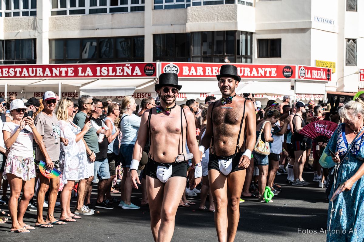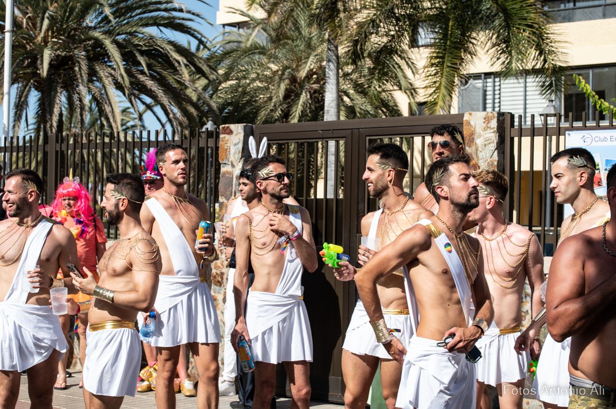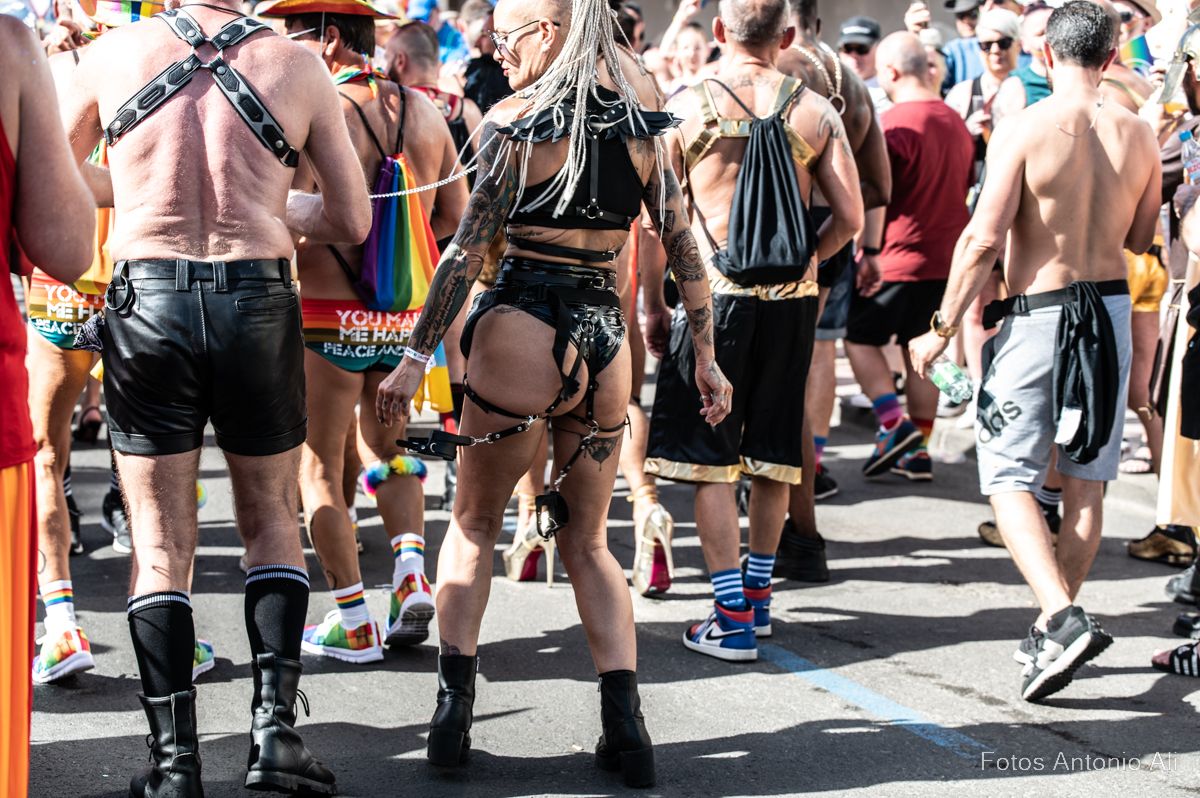Por las calles de Maspalomas se lucieron cuerpos musculados con bañadores diminutos, complementos de cuero, bronceados relucientes, botas militares y barbas estilizadas. No faltaron  los ‘osos’, una subcultura de la comunidad gay  con sus cuerpos fornidos y abundante vello facial y corporal, mientras  que  la comunidad lesbiana se manifestaba con bikinis, tacones, camisas con mangta corta, vestidos y tops decorados con los colores del arco iris.