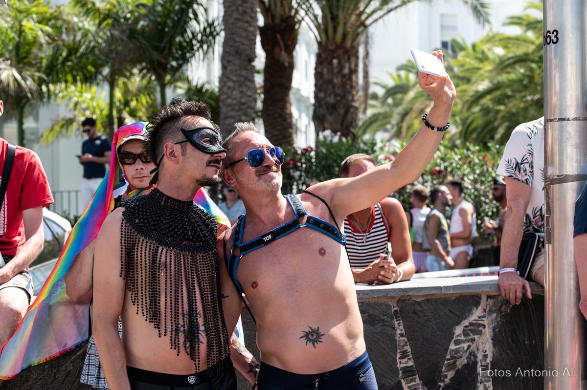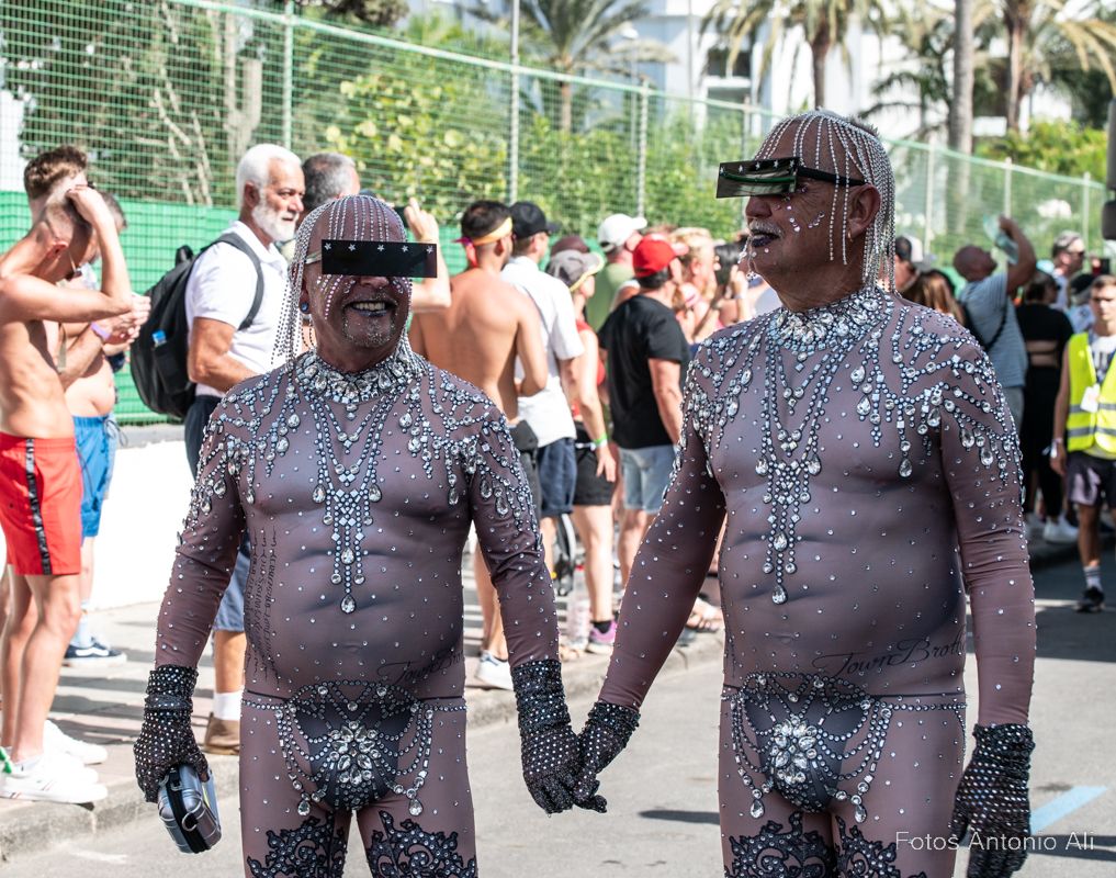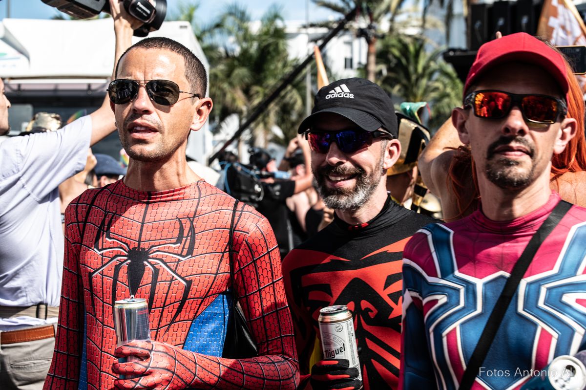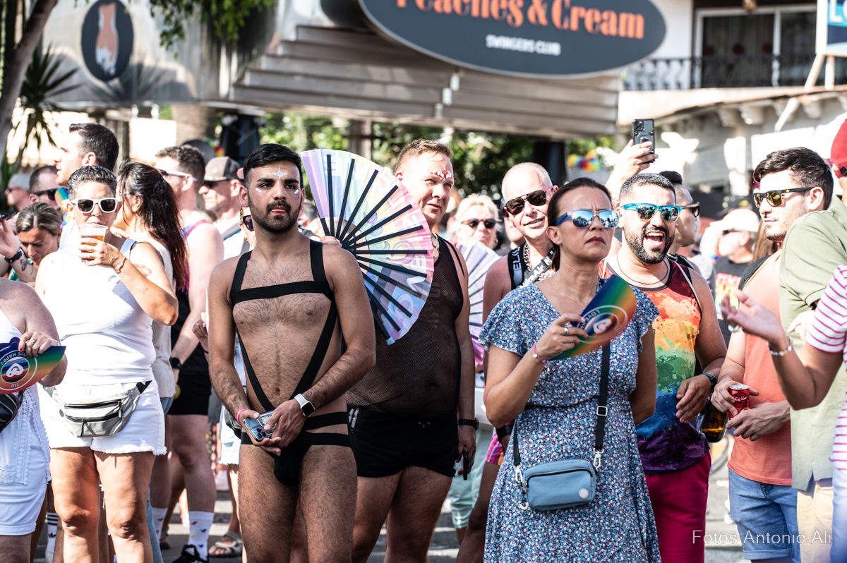 Por las calles de Maspalomas se lucieron cuerpos musculados con bañadores diminutos, complementos de cuero, bronceados relucientes, botas militares y barbas estilizadas. No faltaron  los ‘osos’, una subcultura de la comunidad gay  con sus cuerpos fornidos y abundante vello facial y corporal, mientras  que  la comunidad lesbiana se manifestaba con bikinis, tacones, camisas con mangta corta, vestidos y tops decorados con los colores del arco iris.