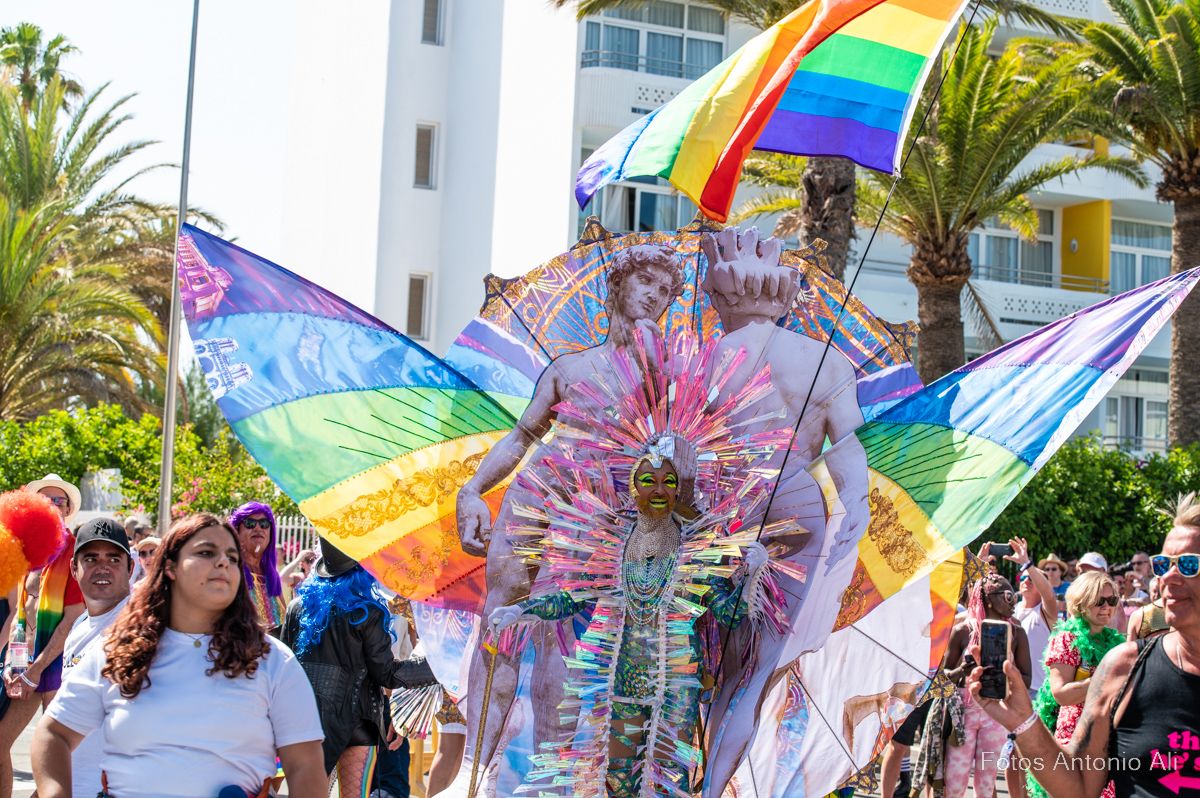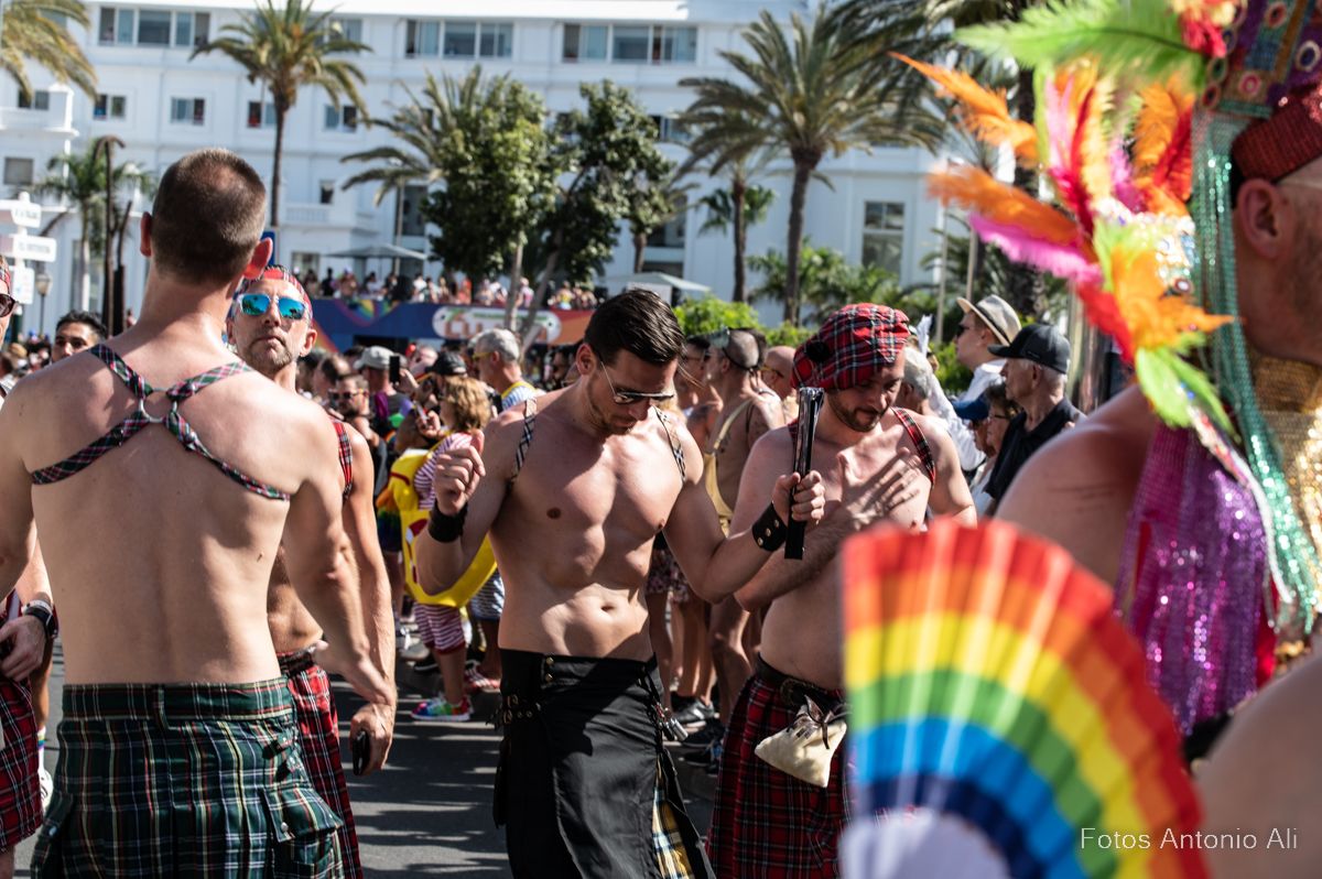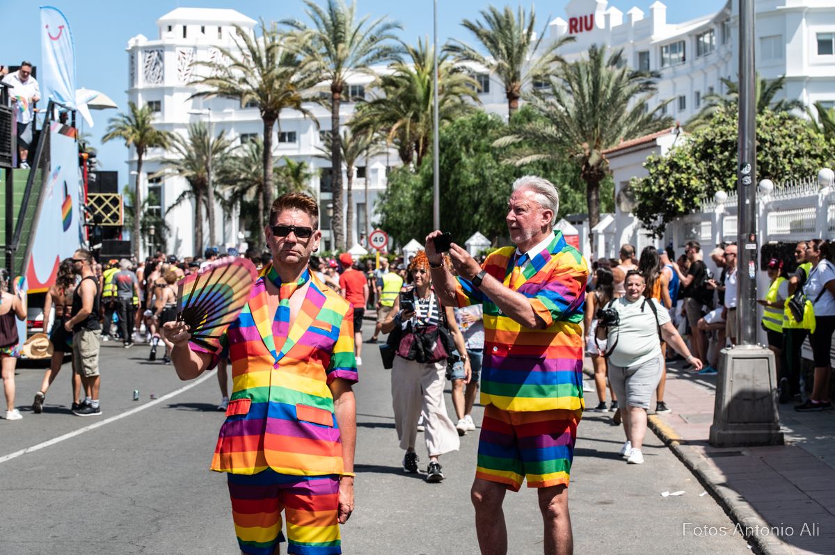 Por las calles de Maspalomas desfilaron miles de personas de varias nacionalidades, que lucieron con orgullo los colores del arcoíris, el emblema creado por Gilbert Baker para defender la tolerancia, en las banderas, gorras,  bañadores y zapatos, además de cientos de banderas que ondeaban en los balcones de hoteles y apartamentos, durante todo el recorrido de la marcha.