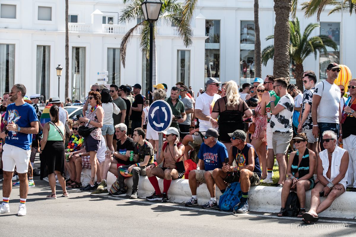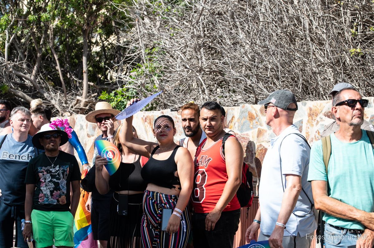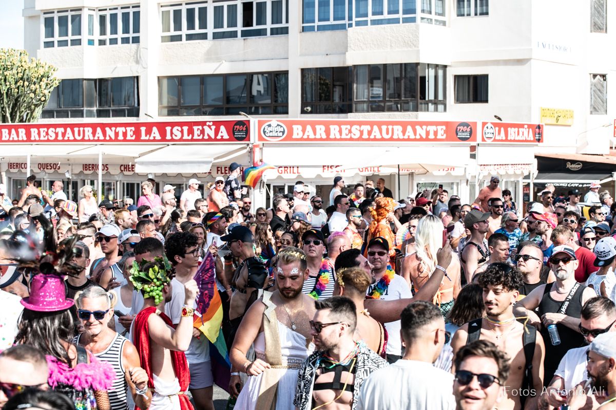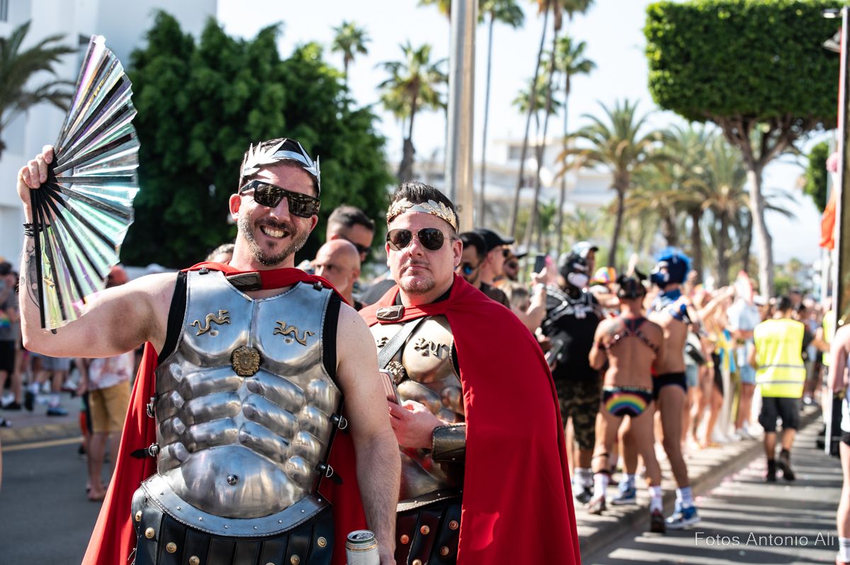 Por las calles de Maspalomas desfilaron miles de personas de varias nacionalidades, que lucieron con orgullo los colores del arcoíris, el emblema creado por Gilbert Baker para defender la tolerancia, en las banderas, gorras,  bañadores y zapatos, además de cientos de banderas que ondeaban en los balcones de hoteles y apartamentos, durante todo el recorrido de la marcha.