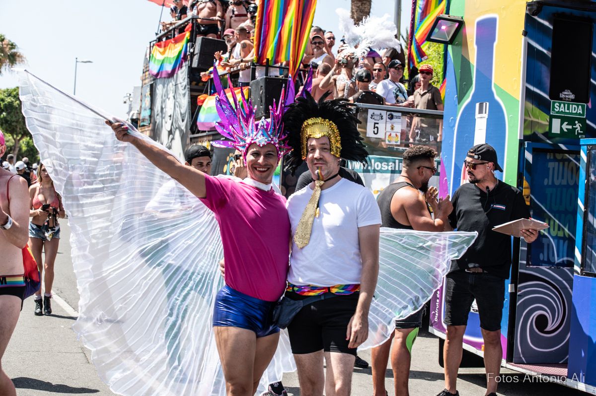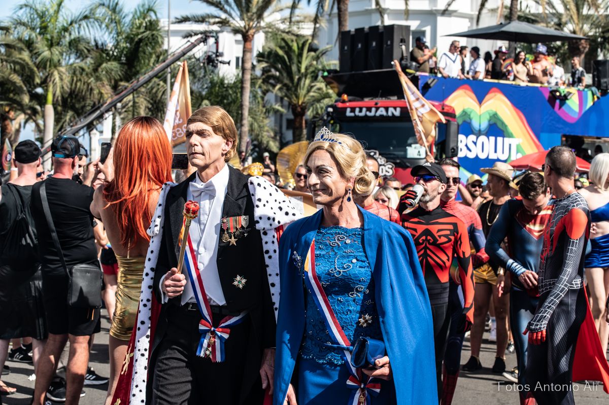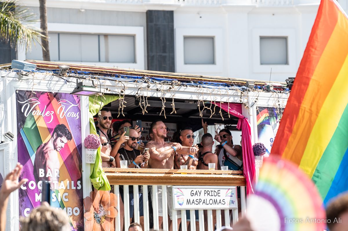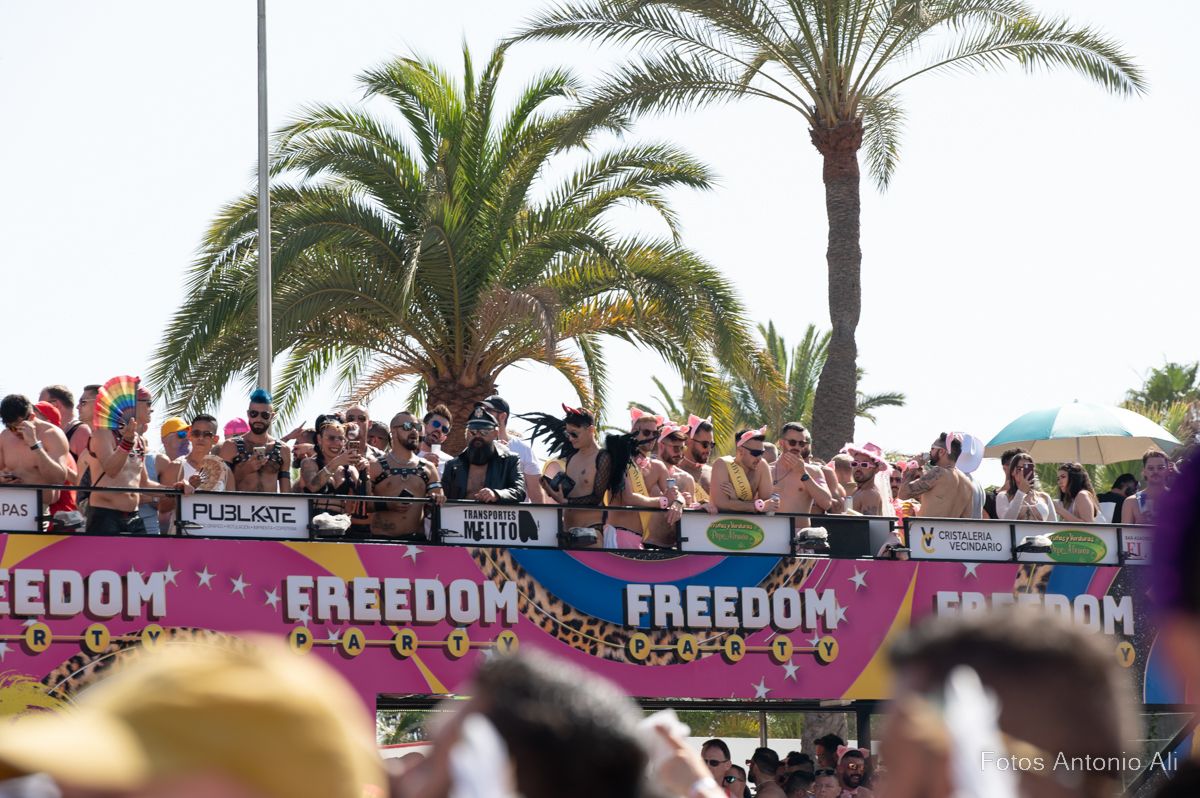 Más de 90.00 personas participaron en el desfile de las 31 carrozas del    Maspalomas Pride by Freedom, según datos de la organización y de los Cuerpos de Seguridad del Estado, que llenó de música, baile y diversión las principales avenidas de Playa del Inglés que se convirtieron en una multitudinaria fiesta para reclamar la libertad, la igualdad y el respeto hacia todas las identidades del colectivo LGTBIQ+.