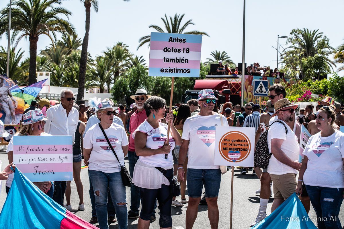 Con una temperatura de 27 grados, la travesía multicolor arrancó a las 17.10 horas, encabezada un año más  por padres, madres y jóvenes de la Asociación Crysallis Canarias portando banderas, gorras y camisetas con el lema ‘No es mi cuerpo es tu mirada’, para reivindicar el respeto a la Diversidad y la identidad sexual de los jóvenes.