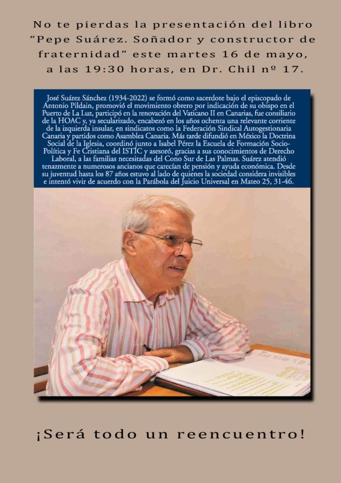 La Casa de la Iglesia, en la capital grancanaria, acogerá este martes (19.30 horas) la presentación del libro Pepe Suárez. Soñador y constructor de fraternidad, una obra biográfica escrita por Antonio Quintana sobre este teldense que fue promotor de la HOAC, fundador de AC y coordinador de la Escuela de Política y Fe hasta 2022.