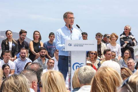Acompañado de la candidata de su partido a la Alcaldía de Las Palmas de Gran Canaria, Jimena Delgado, y del candidato a la Presidencia de Canarias, Manuel Domínguez, Núñez Feijóo ha opinado que Pedro Sánchez ha convertido al PSOE, antes un "partido de Estado que defendía los intereses de la mayoría", ha señalado, en un partido que defiende los intereses "personales" de su secretario general.