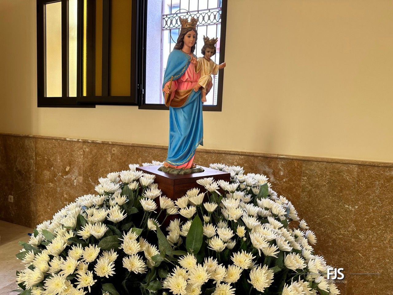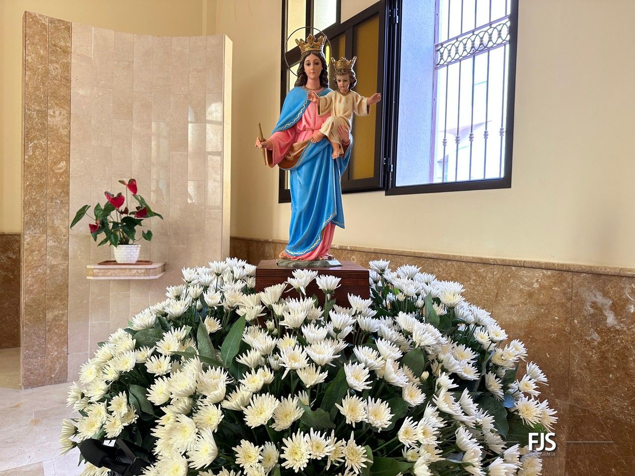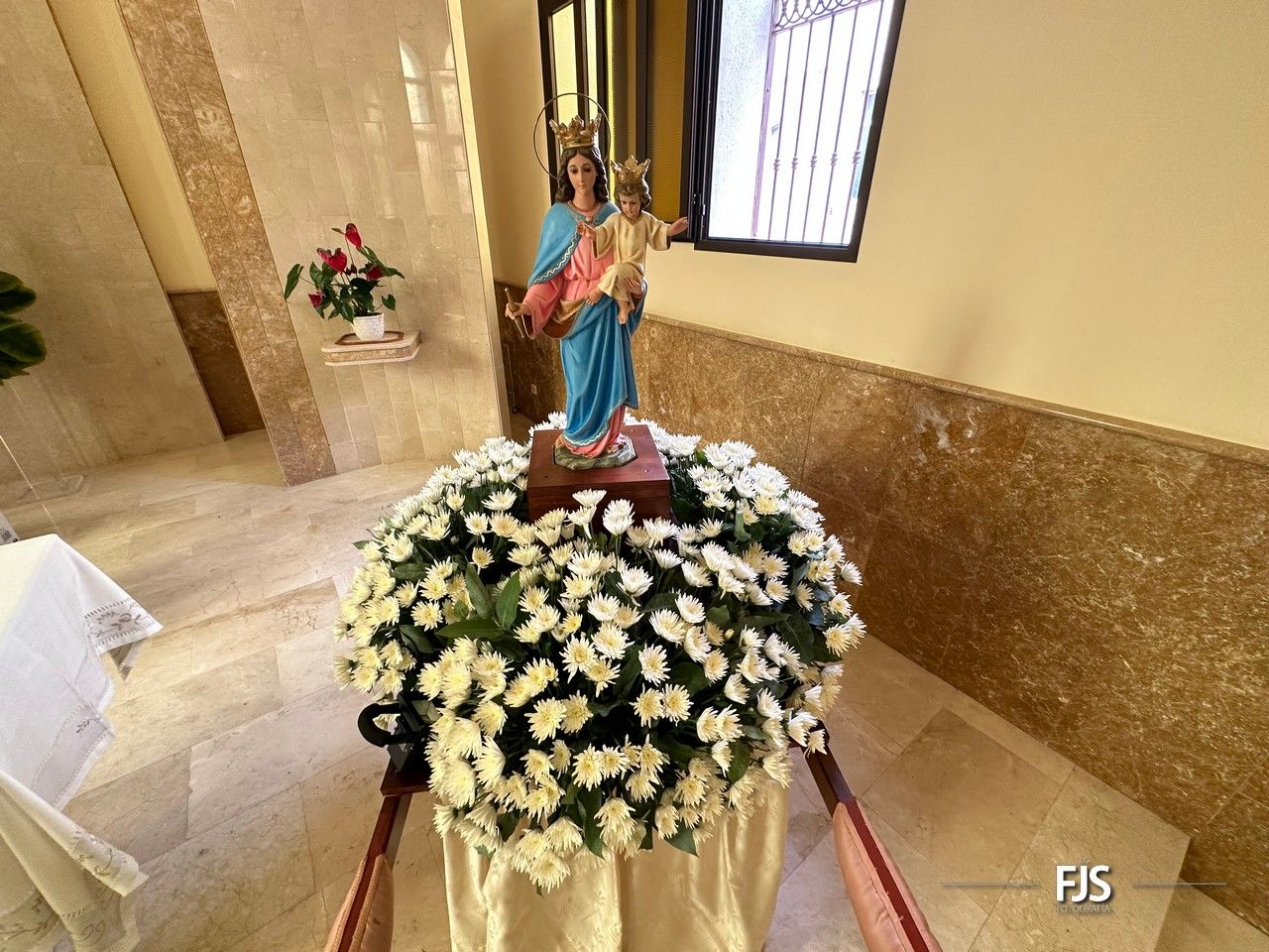 El trono de María Auxiliadora, engalanado con una cuidada ornamentación floral por el diseñador Segundo Amador con lilium y crisantemos de color blancos, anthurium color rosados combinados con hojas de eucalyptus hará su entrada por la puerta que da a la calle de El Salvador, momento en el que será recibida entre vítores y aplausos.