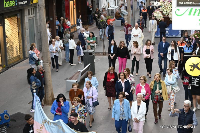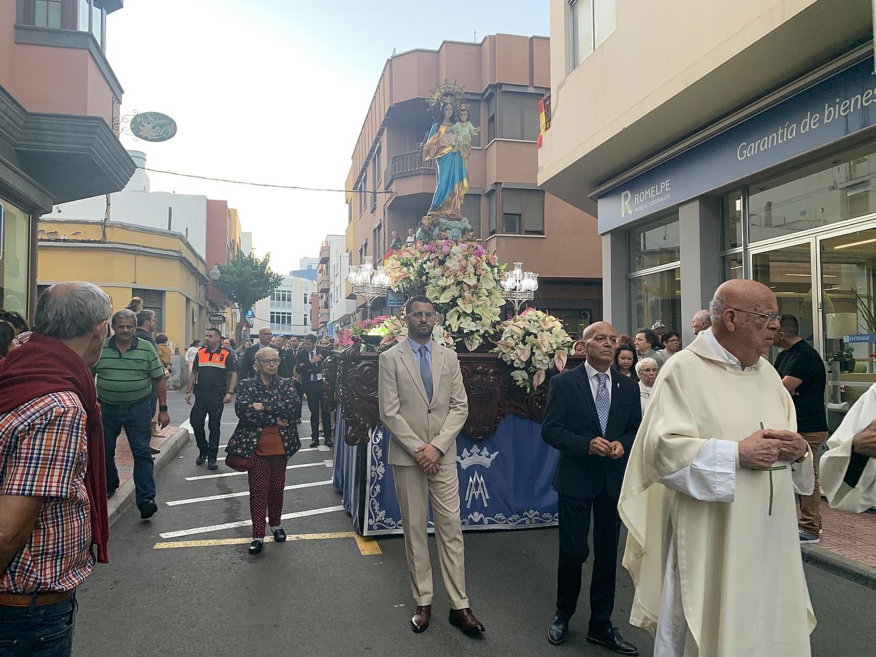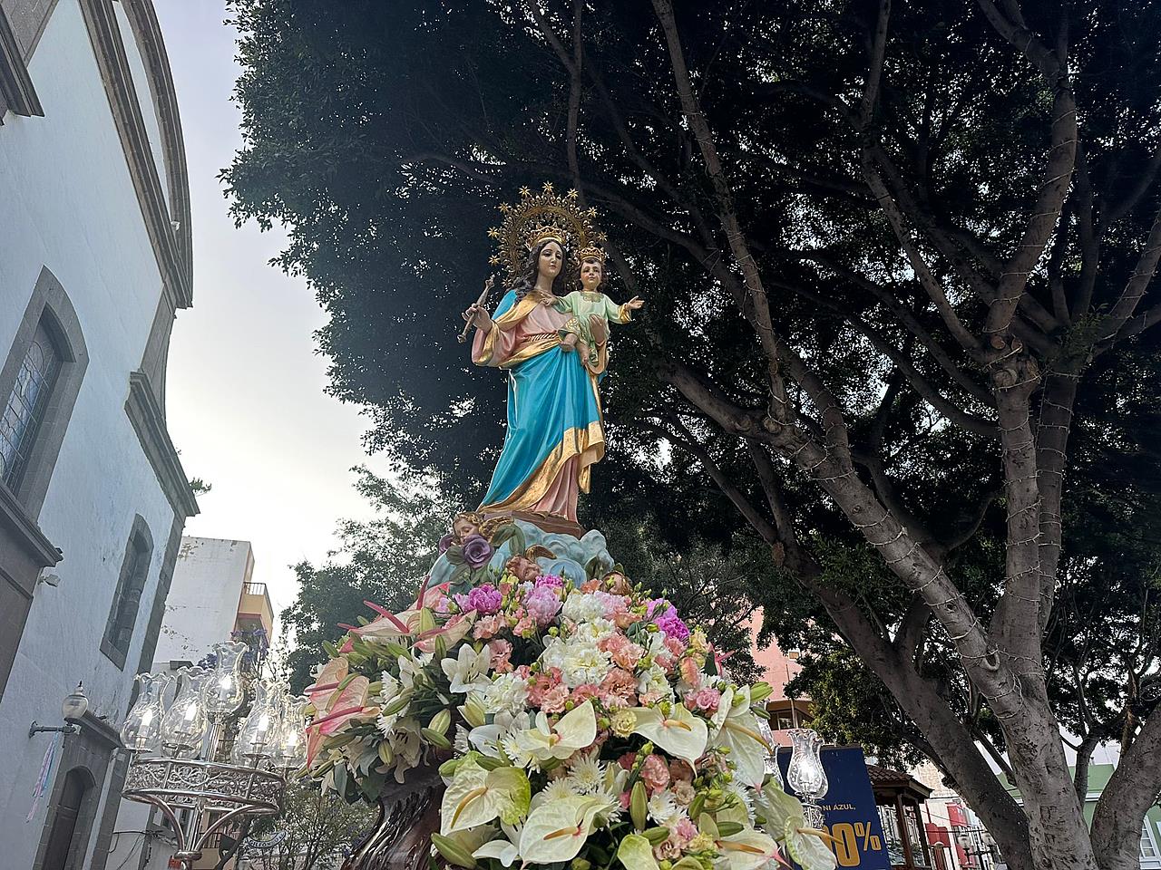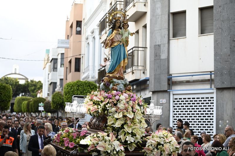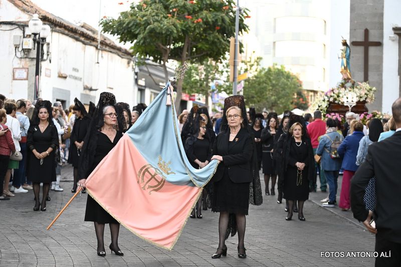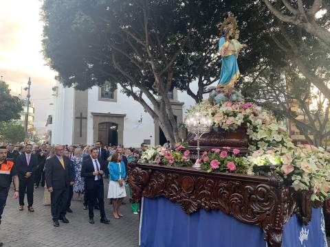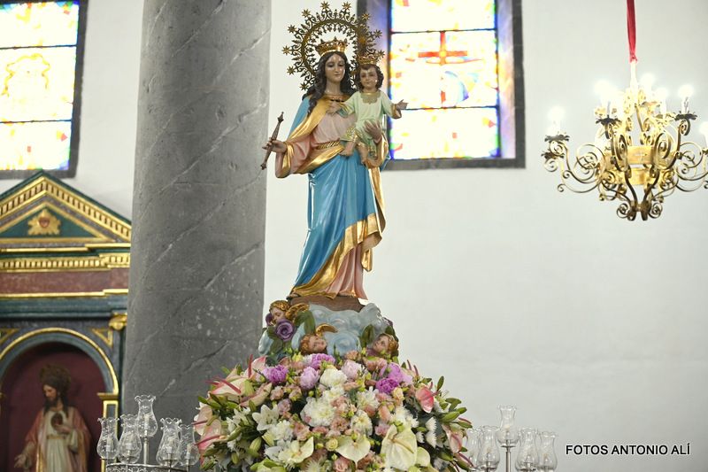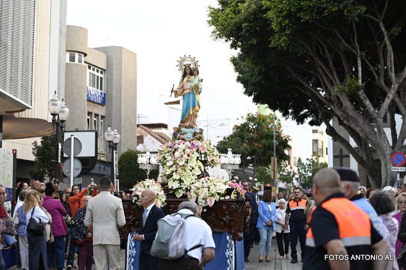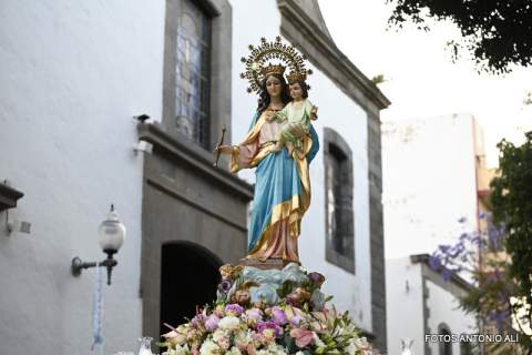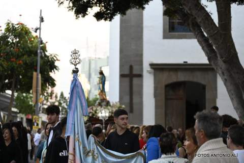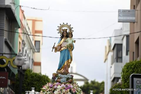 Telde rindió honores esta tarde-noche a María Auxiliadora, en el día de su festividad,  con una misa y posterior procesión de su trono, bellamente engalanado, por las calles de la zona comercial de la ciudad en su habitual recorrido entre el templo de San Gregorio y el patio del colegio salesiano.
