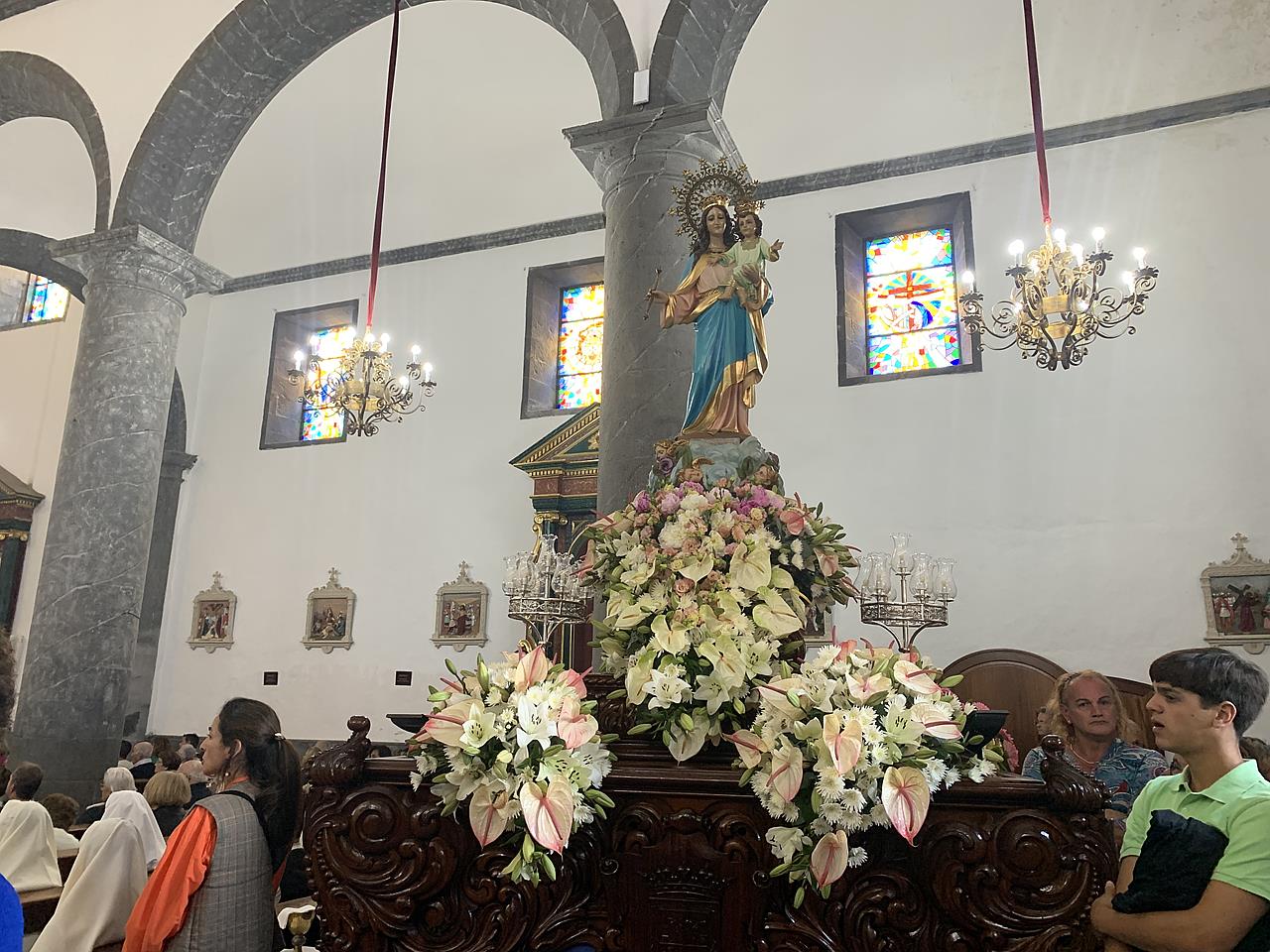 Los asistentes valoraron con halagos el bello ornato floral que presentaba el trono de María Auxiliadora, que presentaba una cuidada ornamentación de lilios y crisantemos blancos y anturios rosados combinados con hojas de eucaliptos.