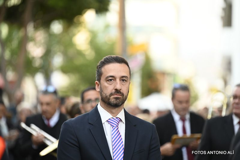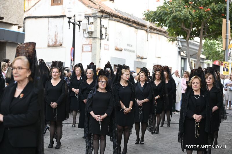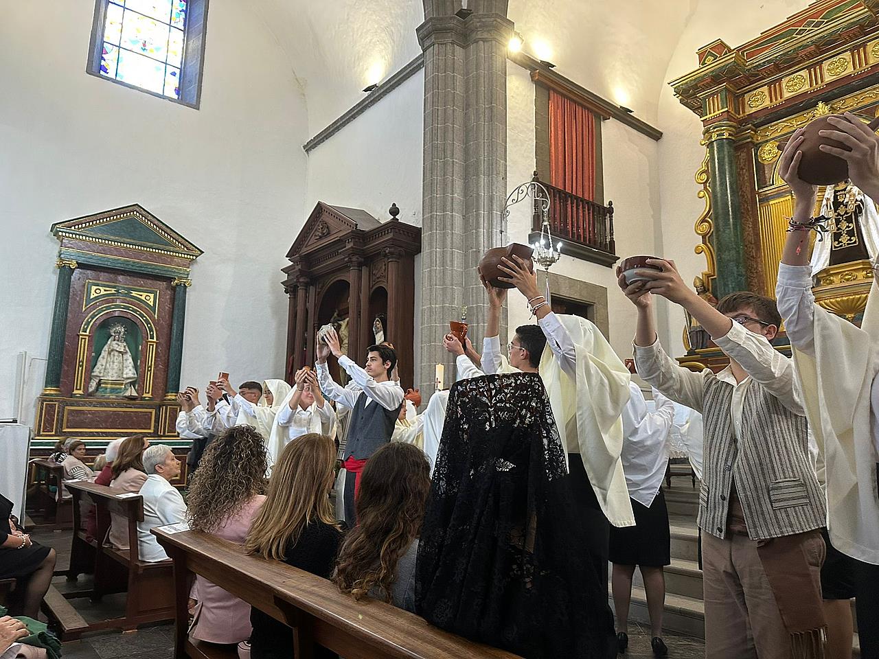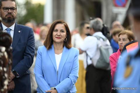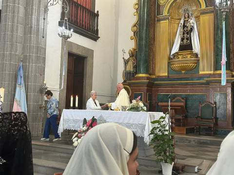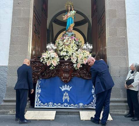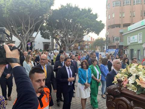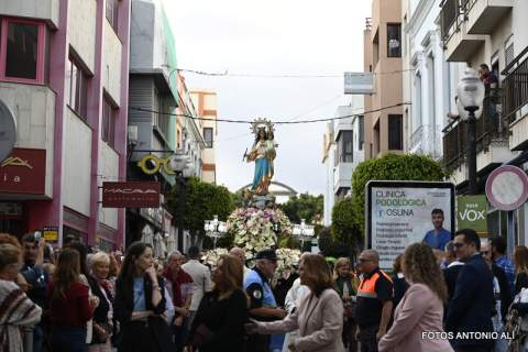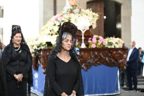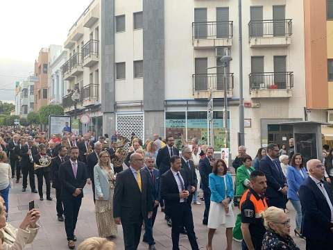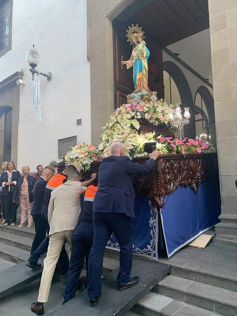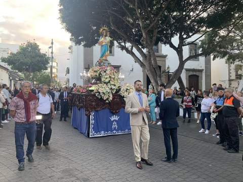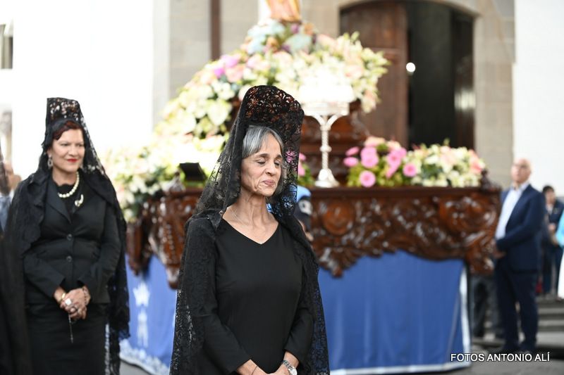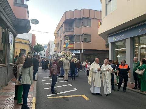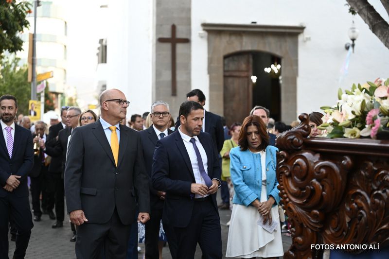 Una salva de voladores saludó la salida del trono de la iglesia, tras la eucaristía oficiada por los sacerdotes Luis Marrero y Agustín Marrero en un santuario abarrotado de feligreses y con la asistencia de una amplia comitiva institucional encabezada por la alcaldesa de la ciudad, Carmen Hernández.