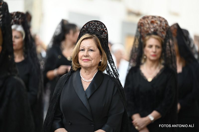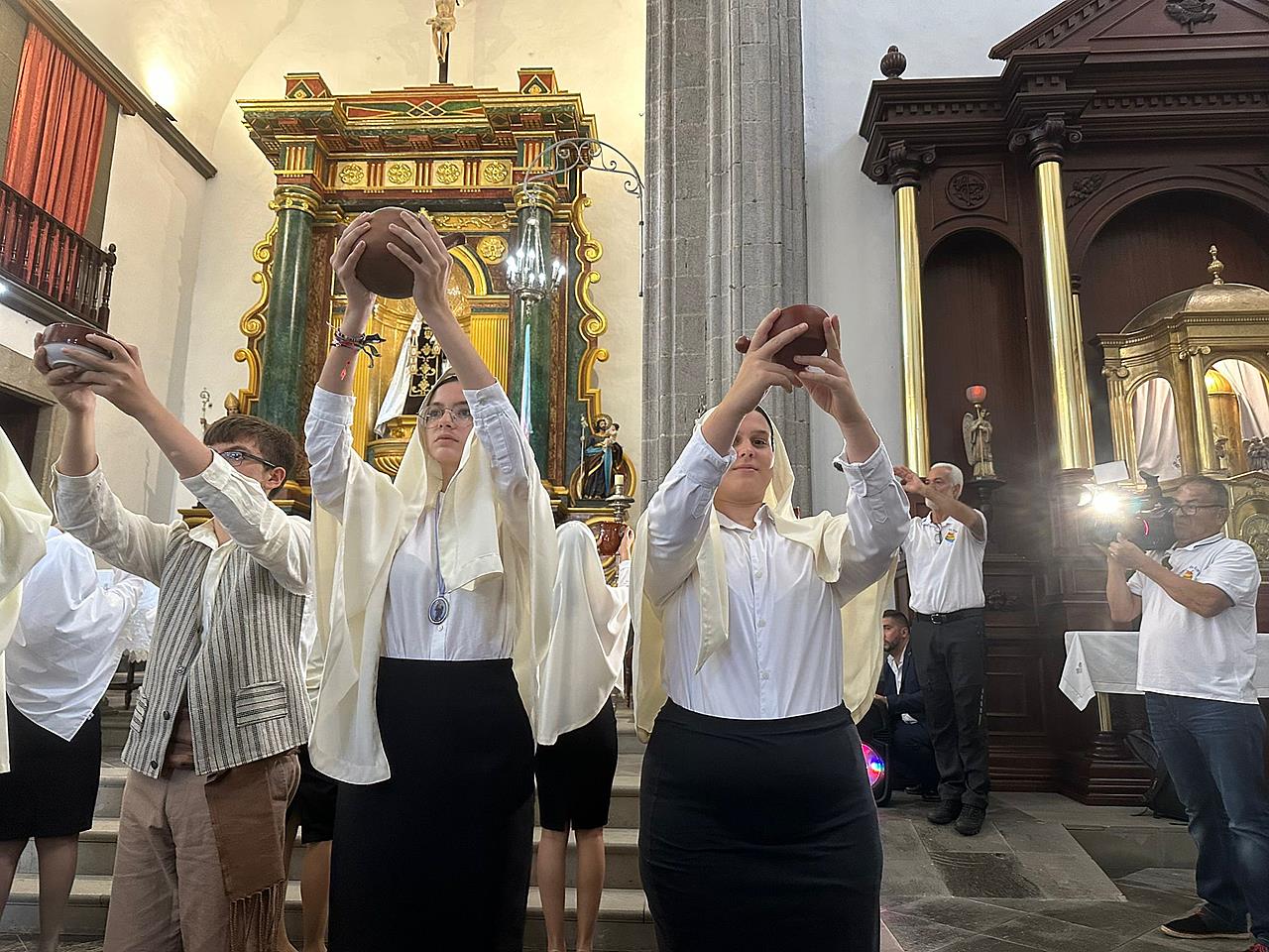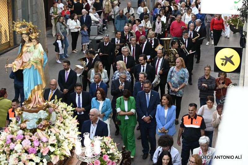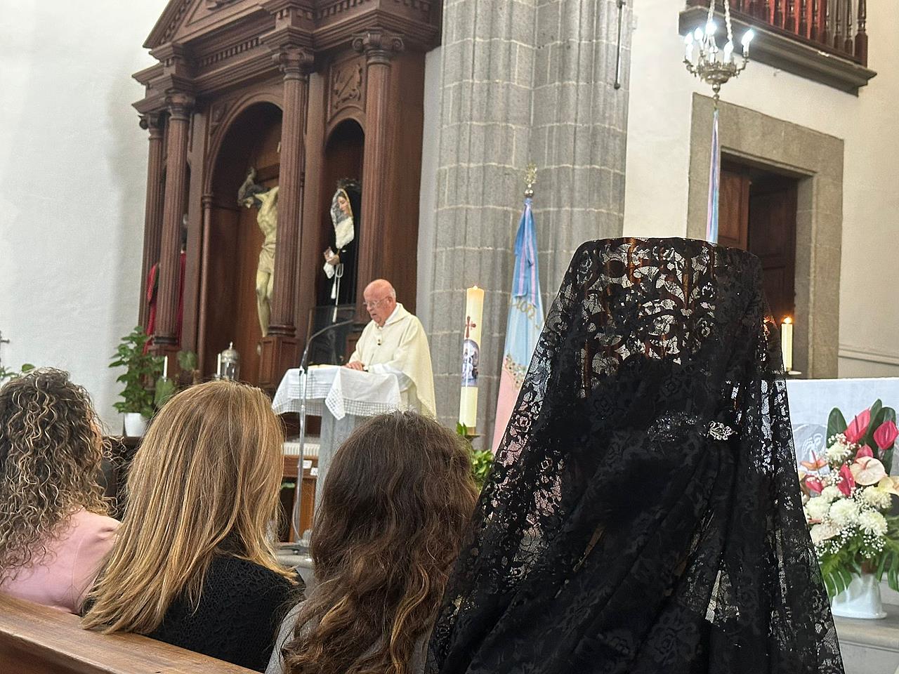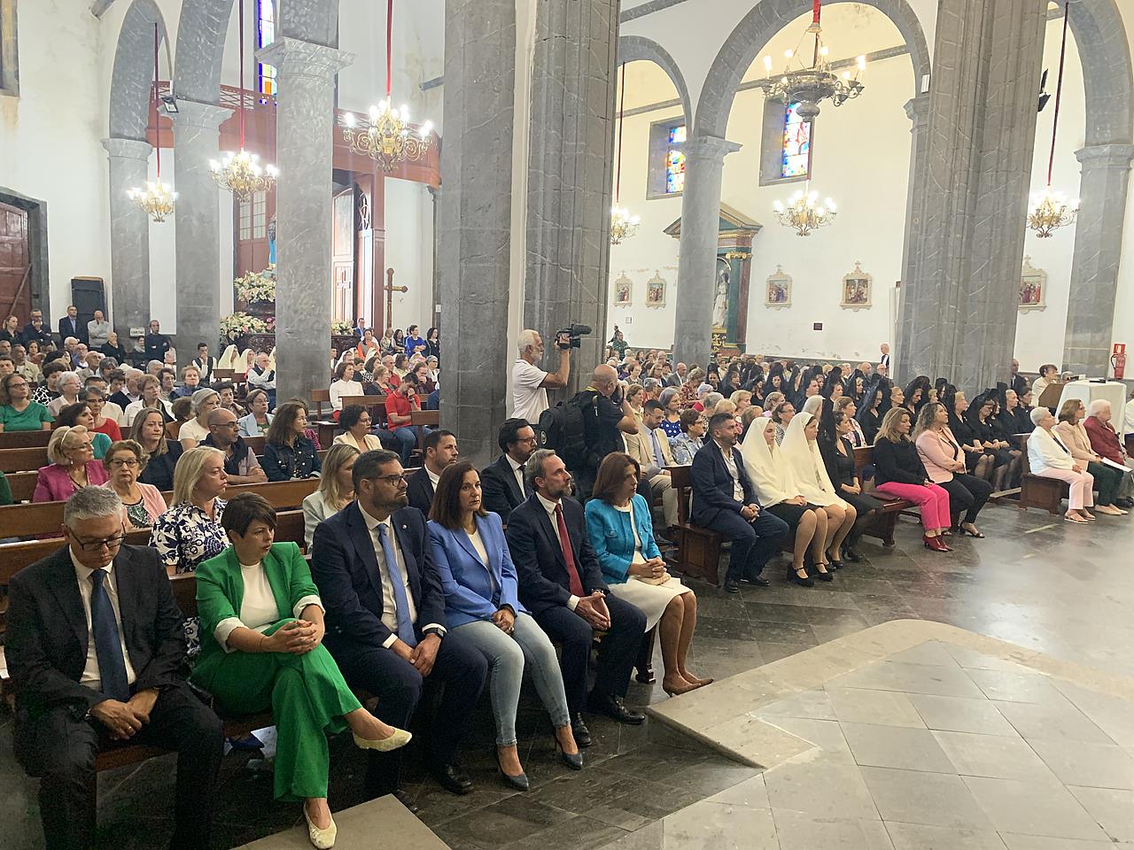 Una salva de voladores saludó la salida del trono de la iglesia, tras la eucaristía oficiada por los sacerdotes Luis Marrero y Agustín Marrero en un santuario abarrotado de feligreses y con la asistencia de una amplia comitiva institucional encabezada por la alcaldesa de la ciudad, Carmen Hernández.