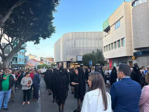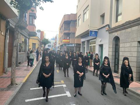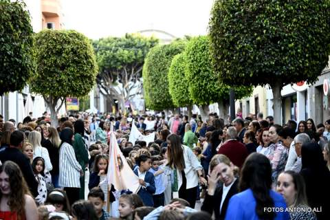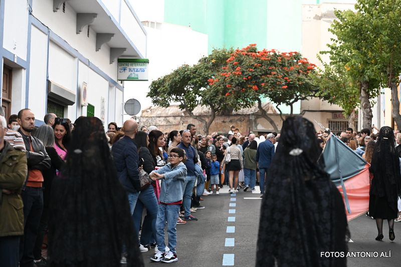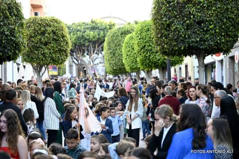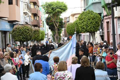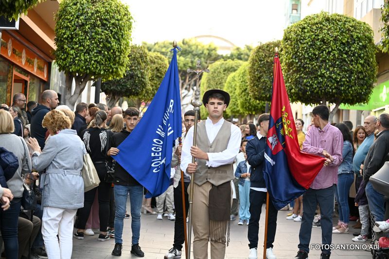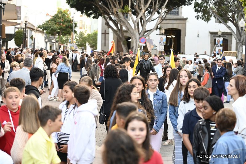 El desfile religioso cumplió el periplo acostumbrado por las céntricas vías de Los Llanos encabezado por el alumnado de Primaria y Secundaria del colegio María Auxiliadora de Telde. Entre ellos, el grupo de 4º de la ESO lucía mantilla y ropa típica canaria y le bailaron un tajaraste a la Virgen, que estuvo acompañada en el recorrido por las tallas de San Juan Bosco y María Mazzarello, a su llegada al patio del colegio con entrada por la calle de El Salvador.