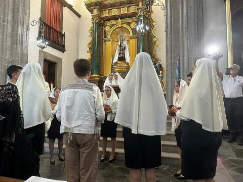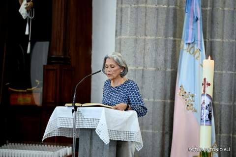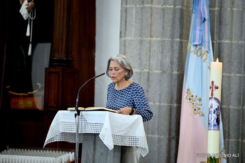 Momento emotivo en que María Auxiliadora fue recibida entre vítores y aplausos. En este aniversario de sus 75 años de presencia en Telde, sor Alma Martell Suárez, antigua alumna del Colegio, e Hija de María Auxiliadora, fue la encargada de agasajar a la Virgen, como gratitud a la Auxiliadora por todo lo vivido en el paso por esta casa, que sin duda ha dado como fruto su vocación salesiana.