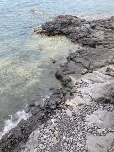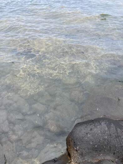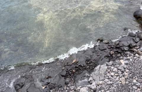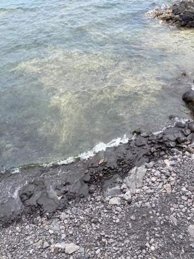 El viento del sudeste ha empujado ese lunes hasta la playa de Salinetas una capa aceitosa de color verdoso y maloliente que los vecinos atribuyen a los restos de pienso que se utilizan para la alimentación de las lubinas y doradas criadas en las jaulas marinas cercanas.